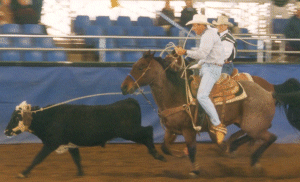 | Roy Alexander making a run at a USTRC with World Champ Jake Barnes. Roy's horse, "Scooter", is a Driftwood bred horse. |